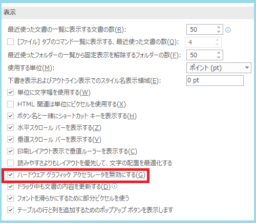 WORDオプション>詳細設定>表示にて 「ハードウェアグラフィックアクセラレータを無効にする」 のチェックが有る場合はこちらにチェックを入れて頂くと改善されます。